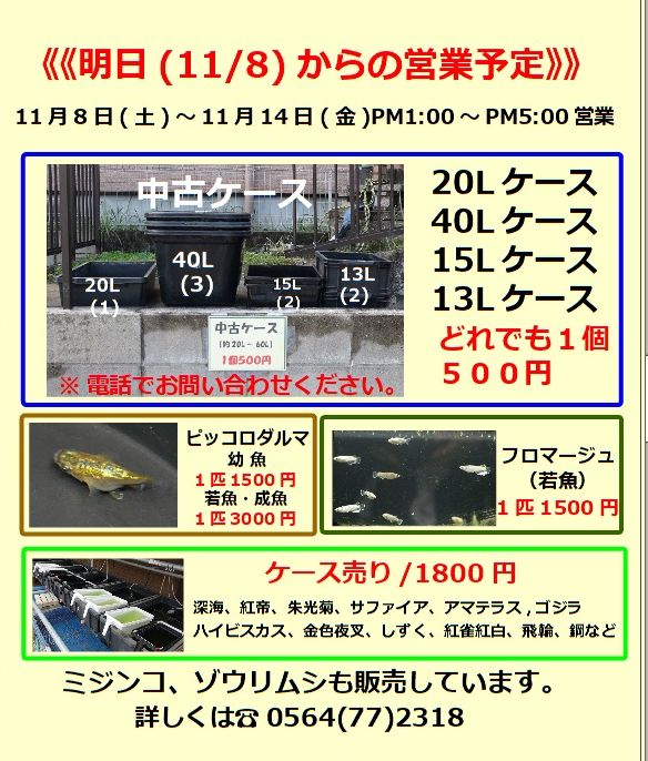 明日(11/8~11/14)からの営業予定です。よろしくお願いいたします。